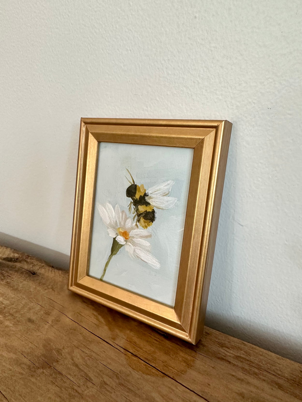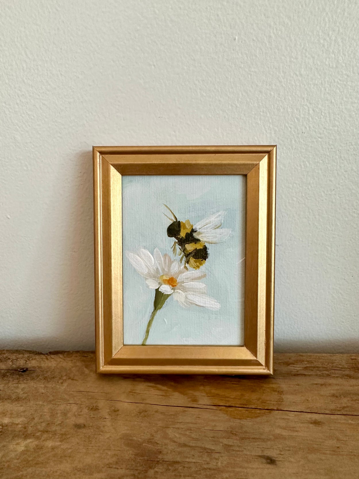 This painting celebrates the beauty and servanthood of the bee. It is acrylic on panel set into a golden frame. The painting size is 3”x 4” and the frame adds about a 1/2 inch to each side. It is varnished and ready to hang.