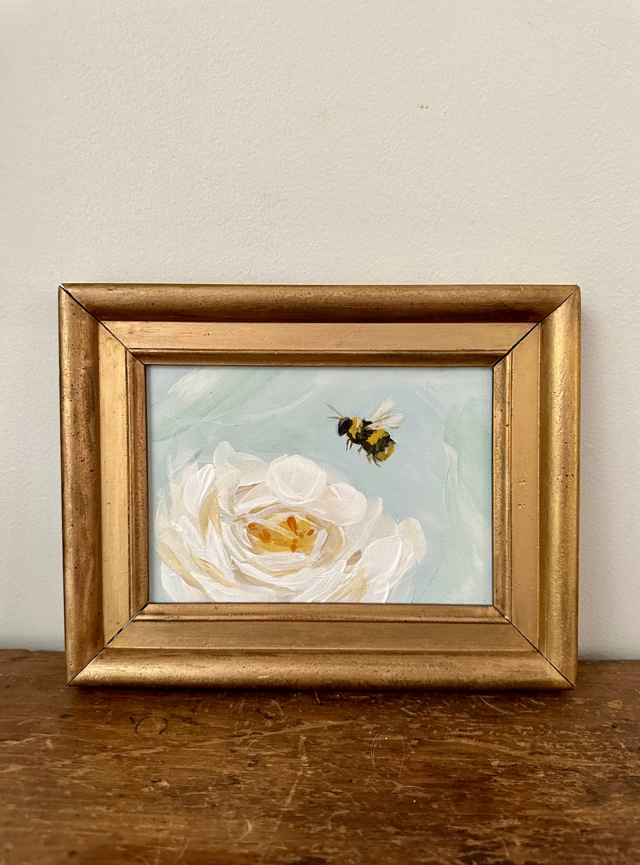 This painting celebrates the peacefulness of the bee. It is acrylic on panel set into a vintage golden frame. The painting size is 5”x7” and the frame adds about an inch to each side. Because this frame is vintage please expect imperfections. That is part of the beauty and uniqueness of the frame. It is varnished and ready to hang.