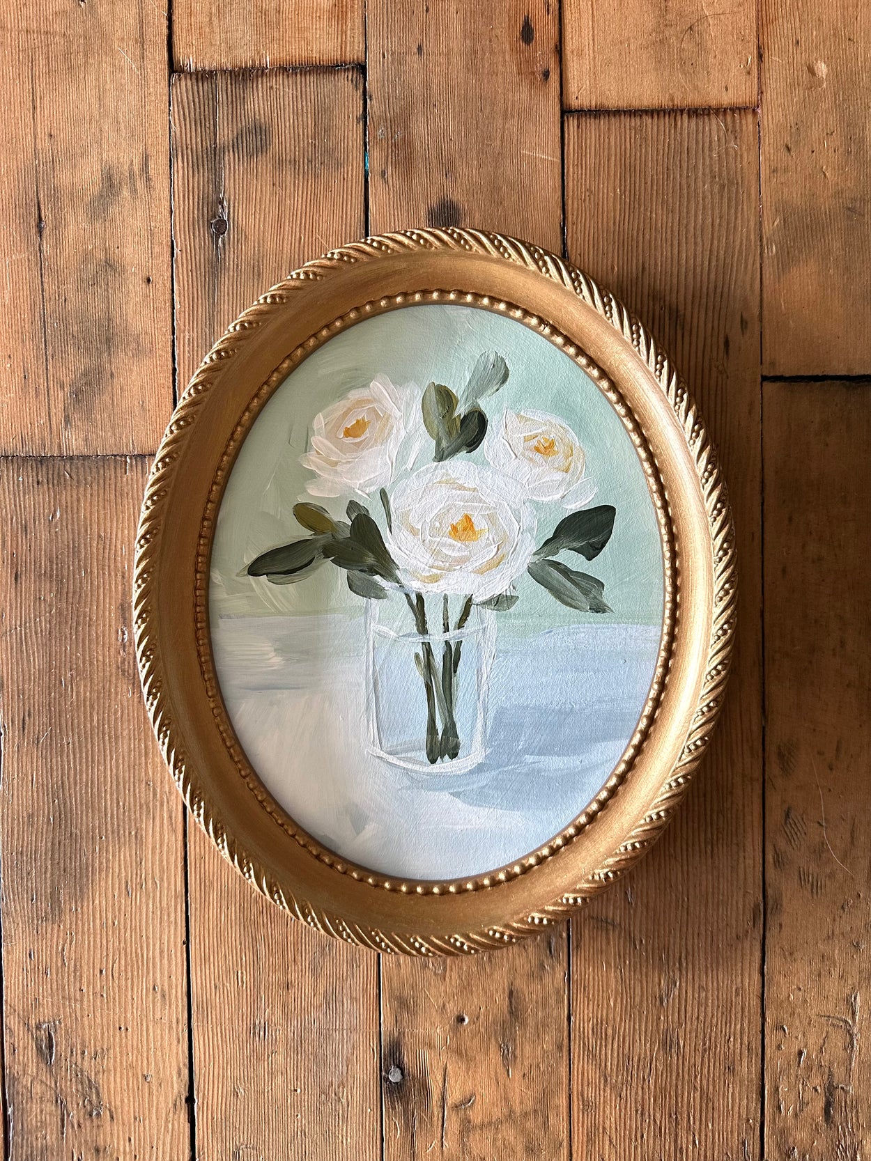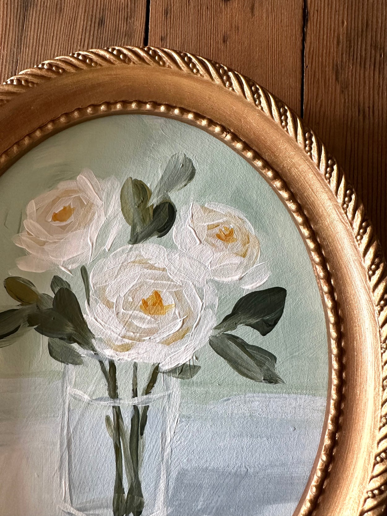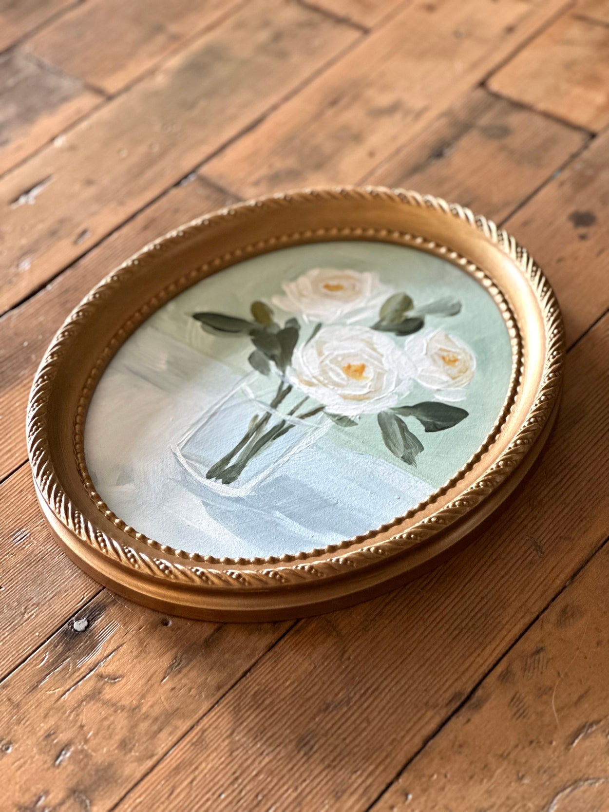 This painting celebrates the beauty of the rose. It is acrylic on panel set into a vintage golden frame. The painting size is an 8”x 10” oval and the frame adds about an inch to each side. Because this frame is vintage please expect imperfections. That is part of the beauty and uniqueness of the frame. It is varnished and ready to hang.