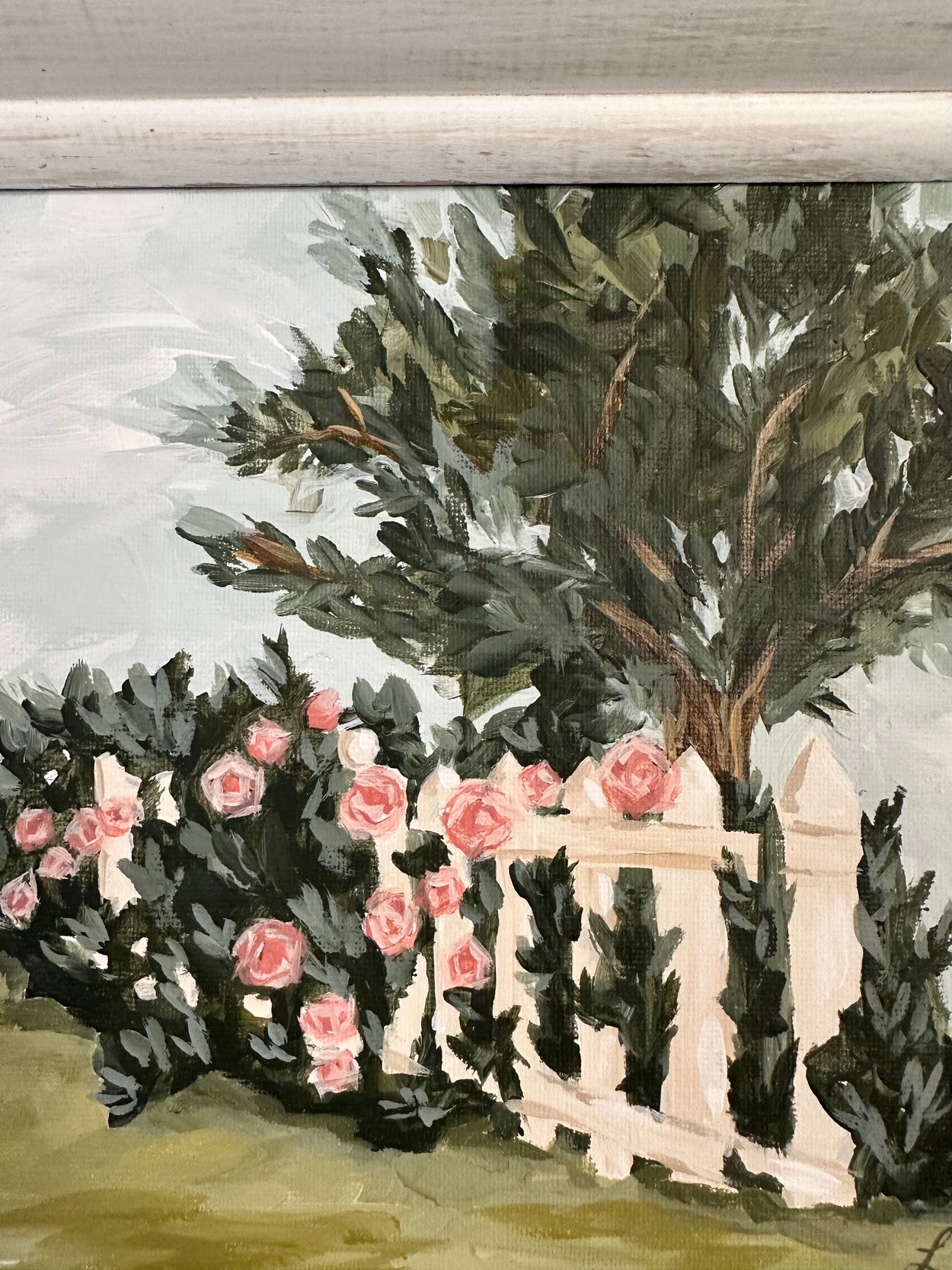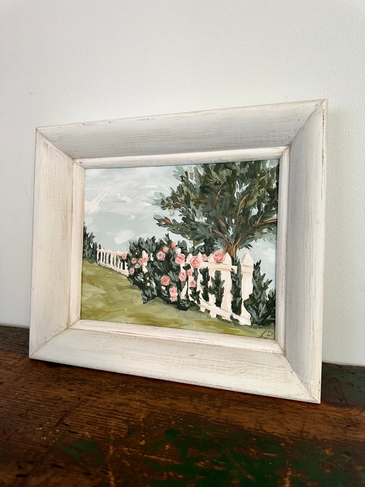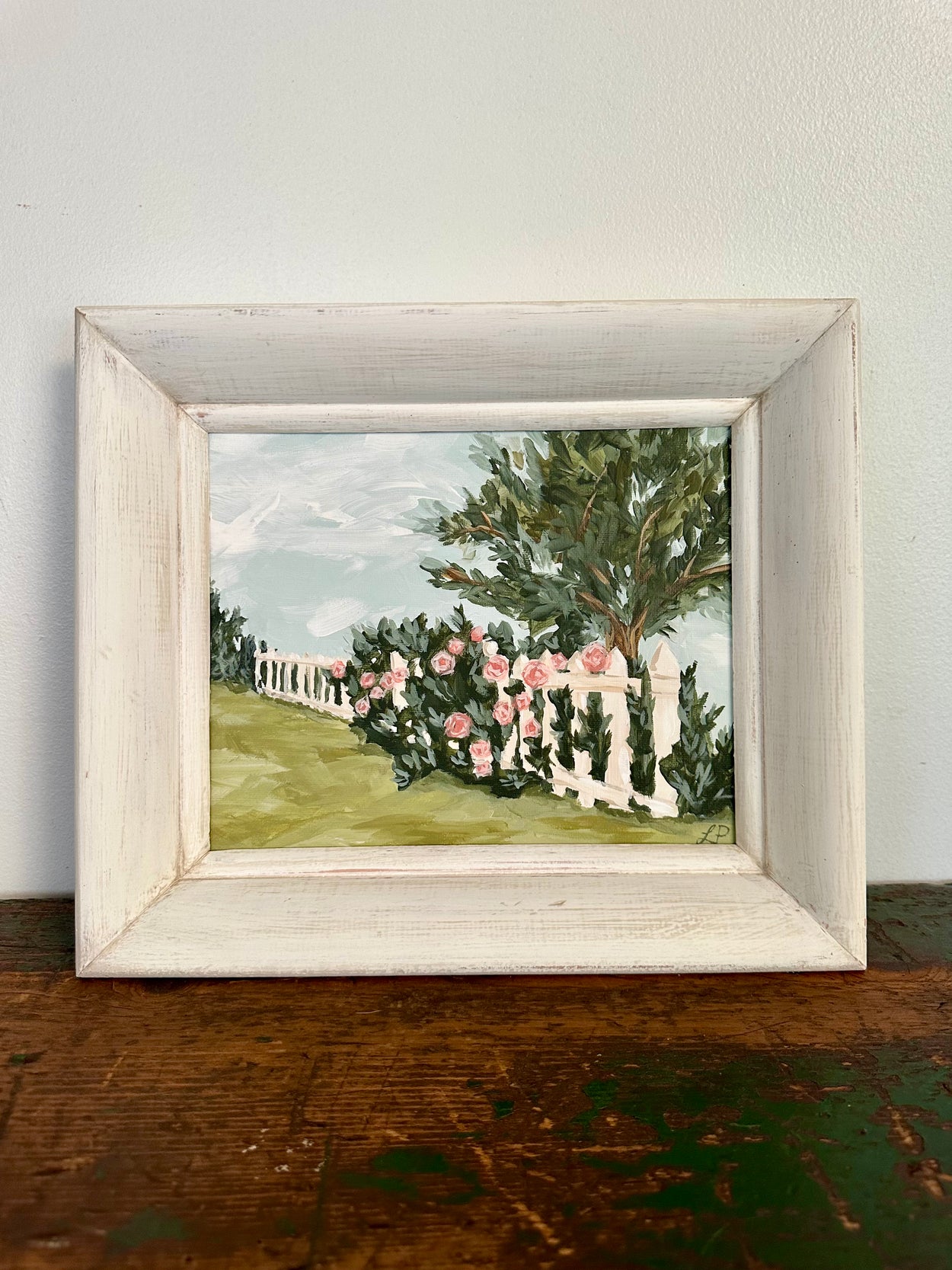 This painting celebrates the rose seeing a fence as a provision and not a barrier. It is acrylic on panel set into a vintage white wood frame. The painting size is 8”x 10” and the frame adds about an 3 inches to each side. Because this frame is vintage please expect imperfections. That is part of the beauty and uniqueness of the frame. It is varnished and ready to hang.