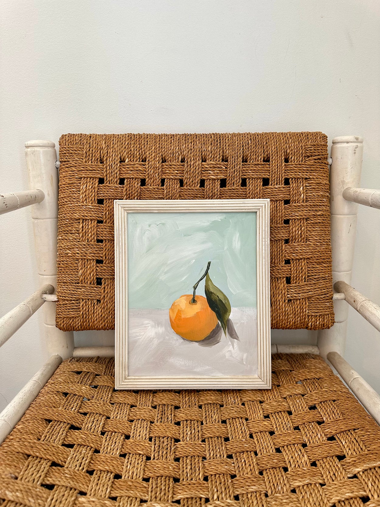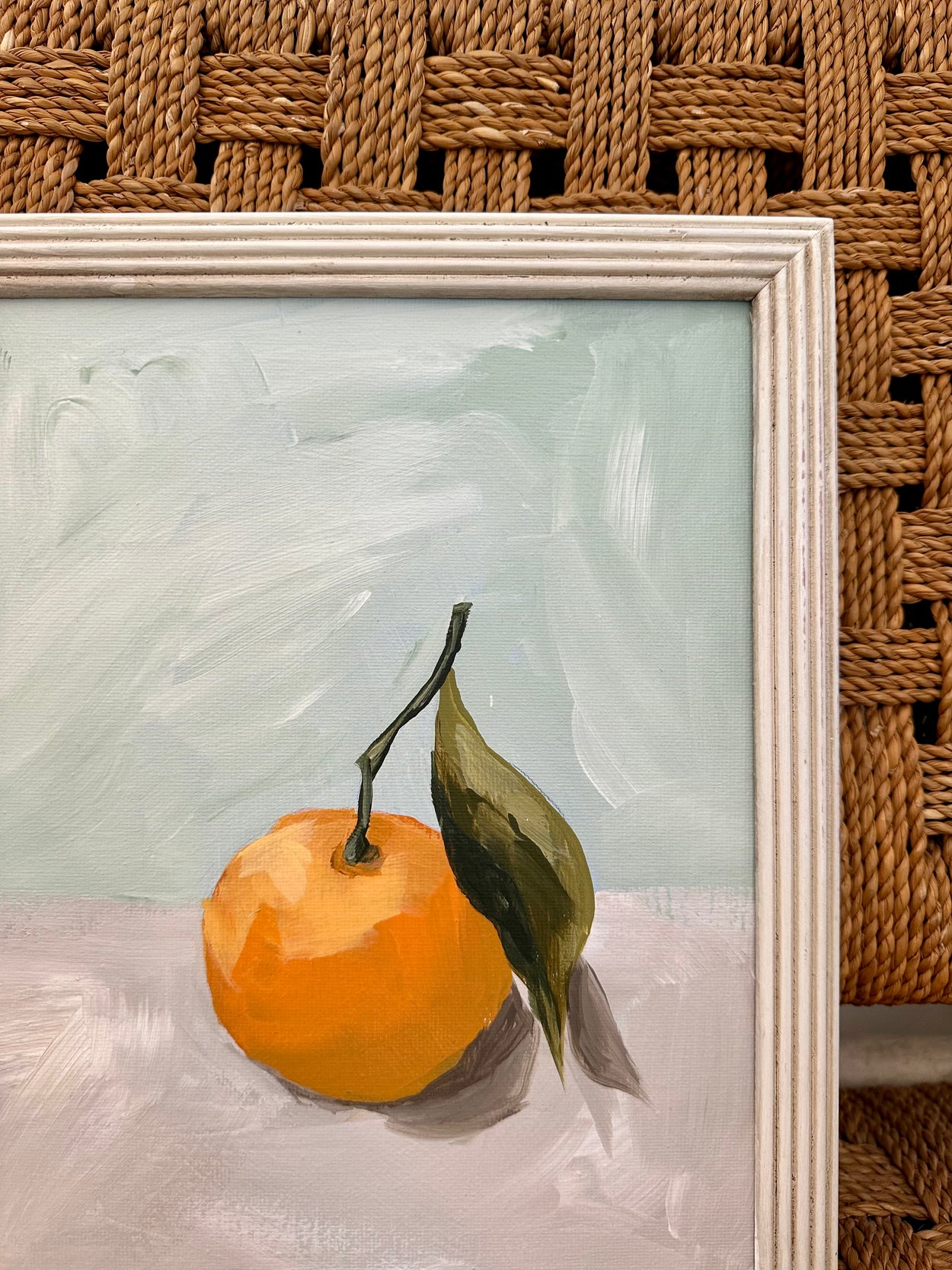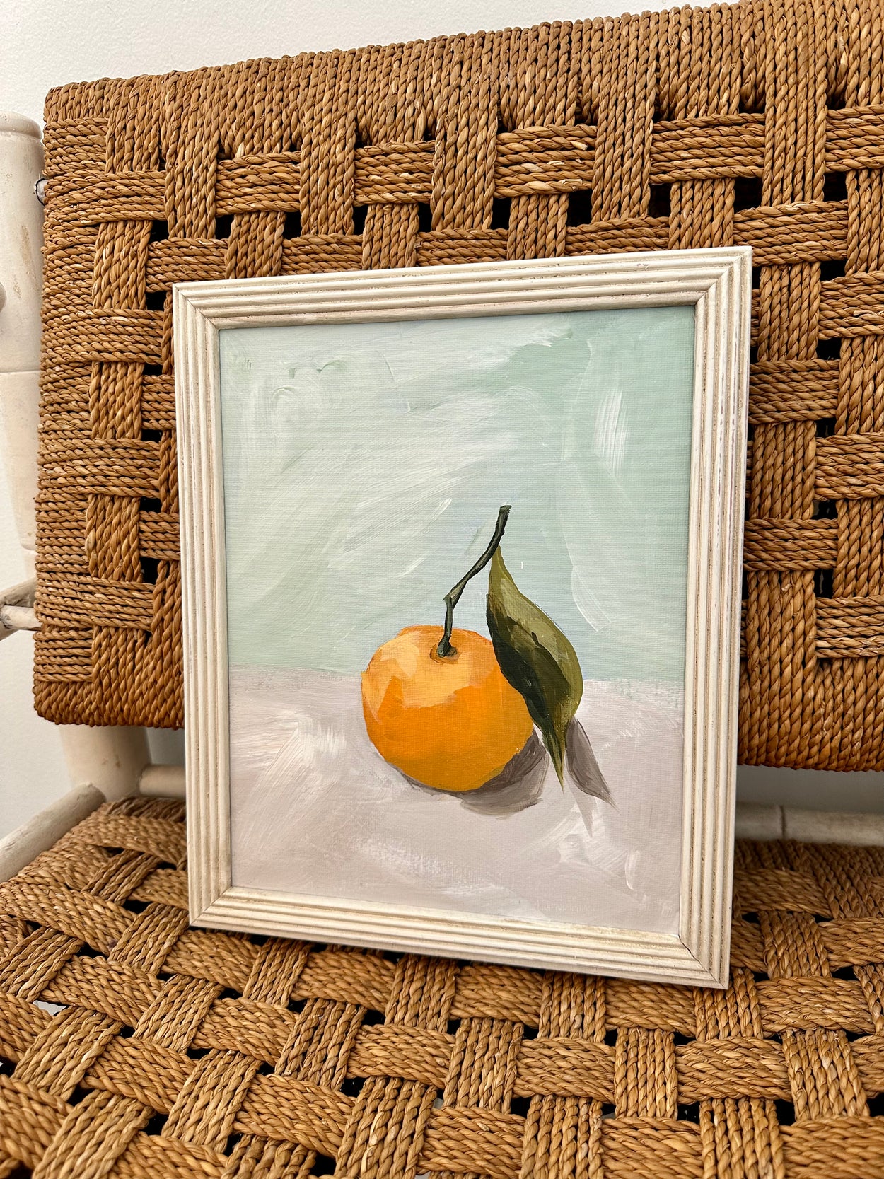 This painting captures the beauty and simplicity of the orange. It is acrylic on panel set into a vintage frame. The painting size is 8”x10” and the frame adds about an inch to each side. Because this frame is vintage please expect imperfections. That is part of the beauty and uniqueness of the frame. The painting is varnished and ready to hang.