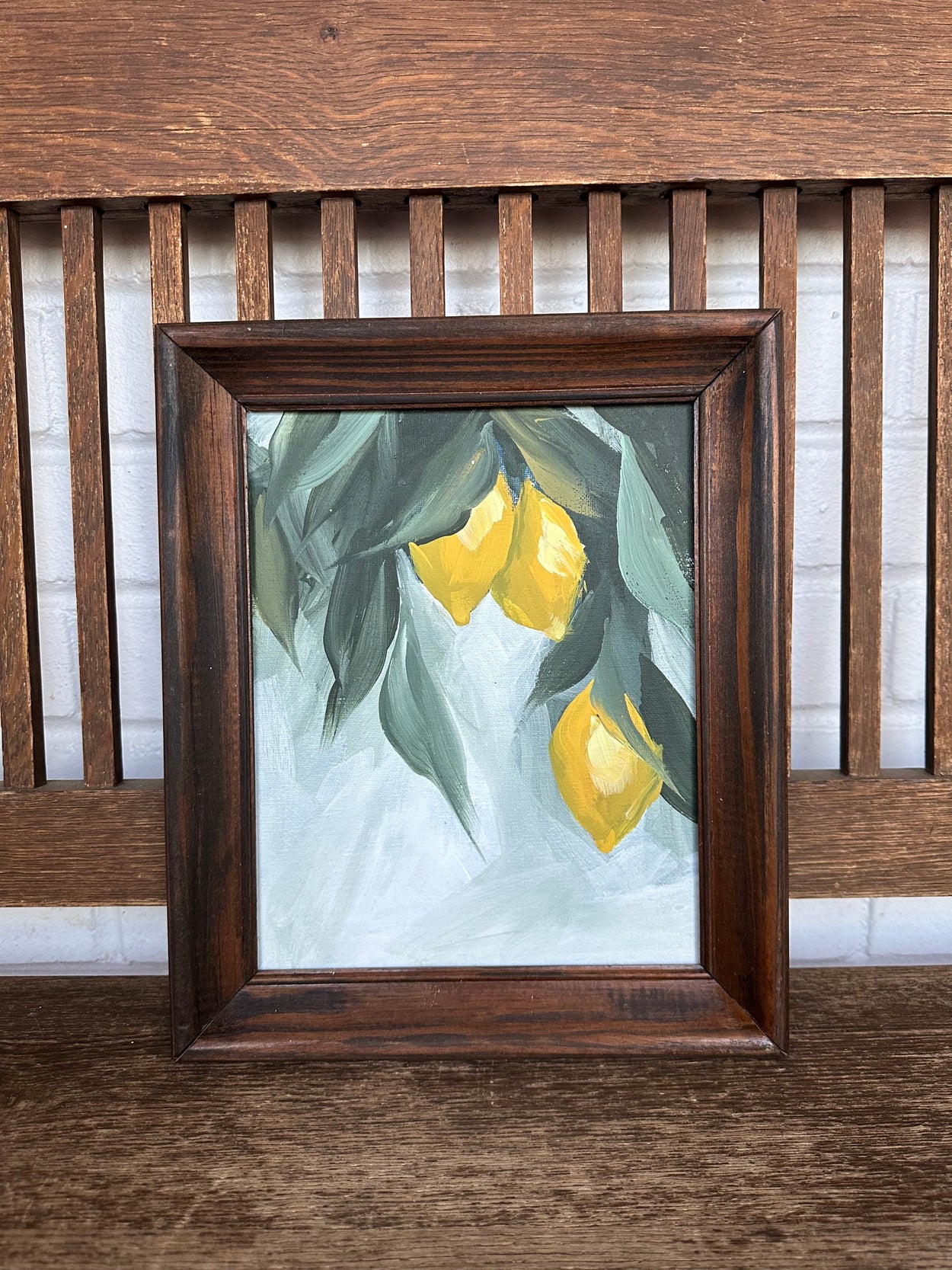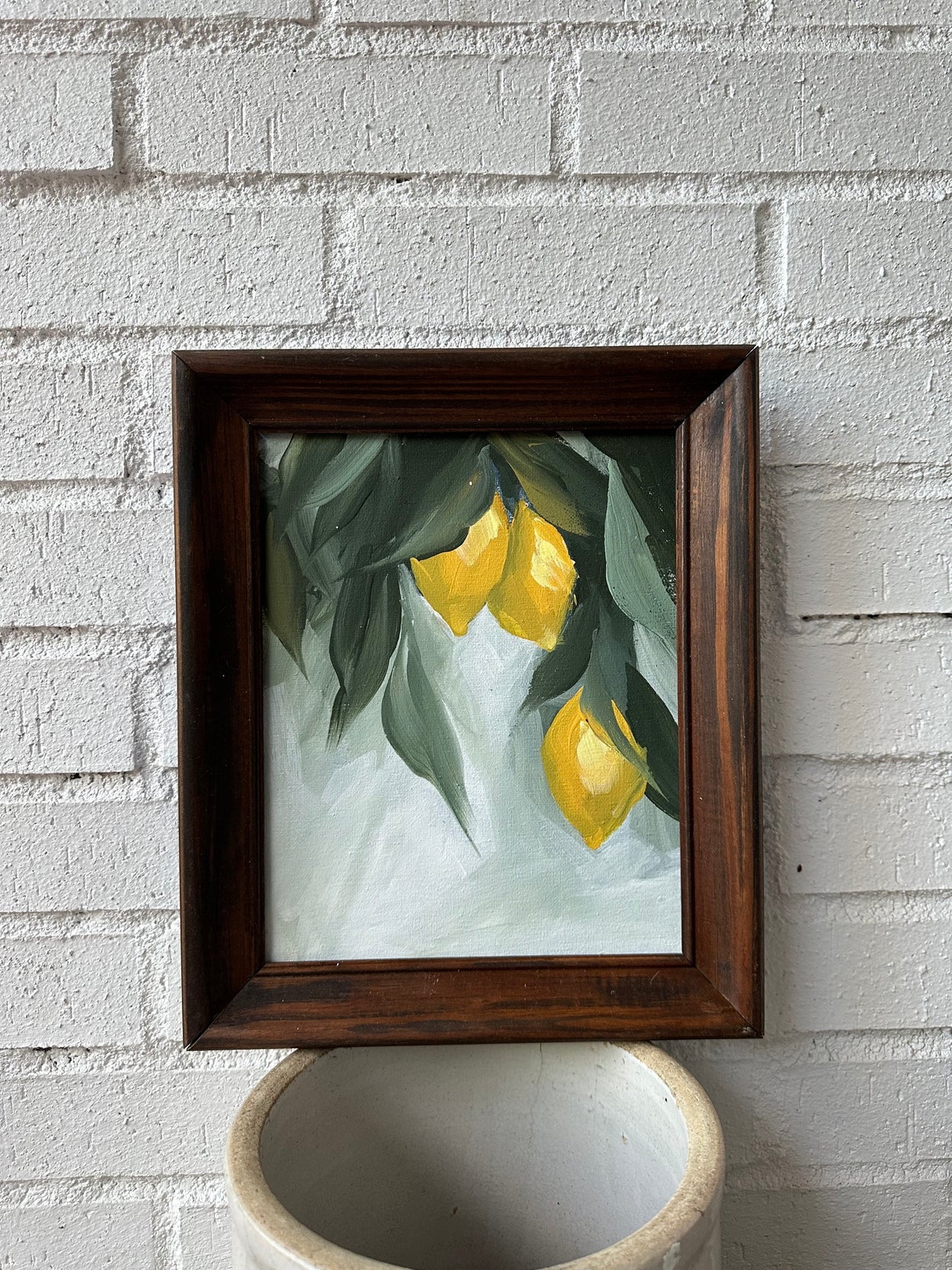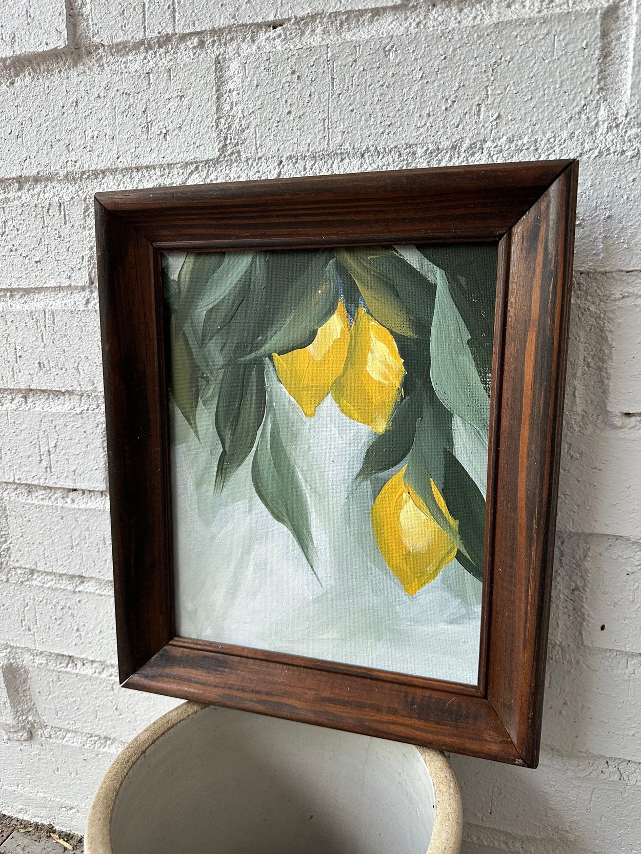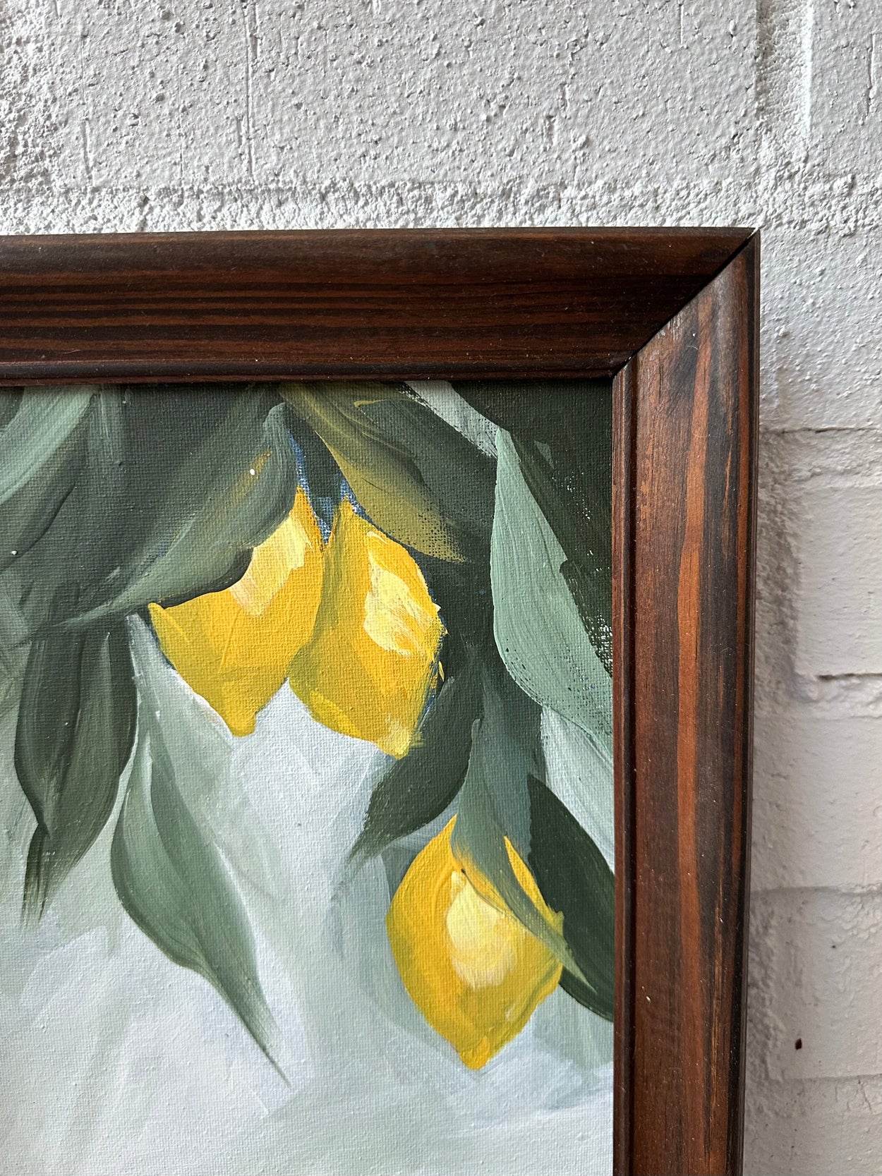 This is an acrylic still life painting paired with a beautifully worn vintage frame. This painting has a lovely moodiness and is ready to make any space feel cozy. It is varnished and ready to hang.