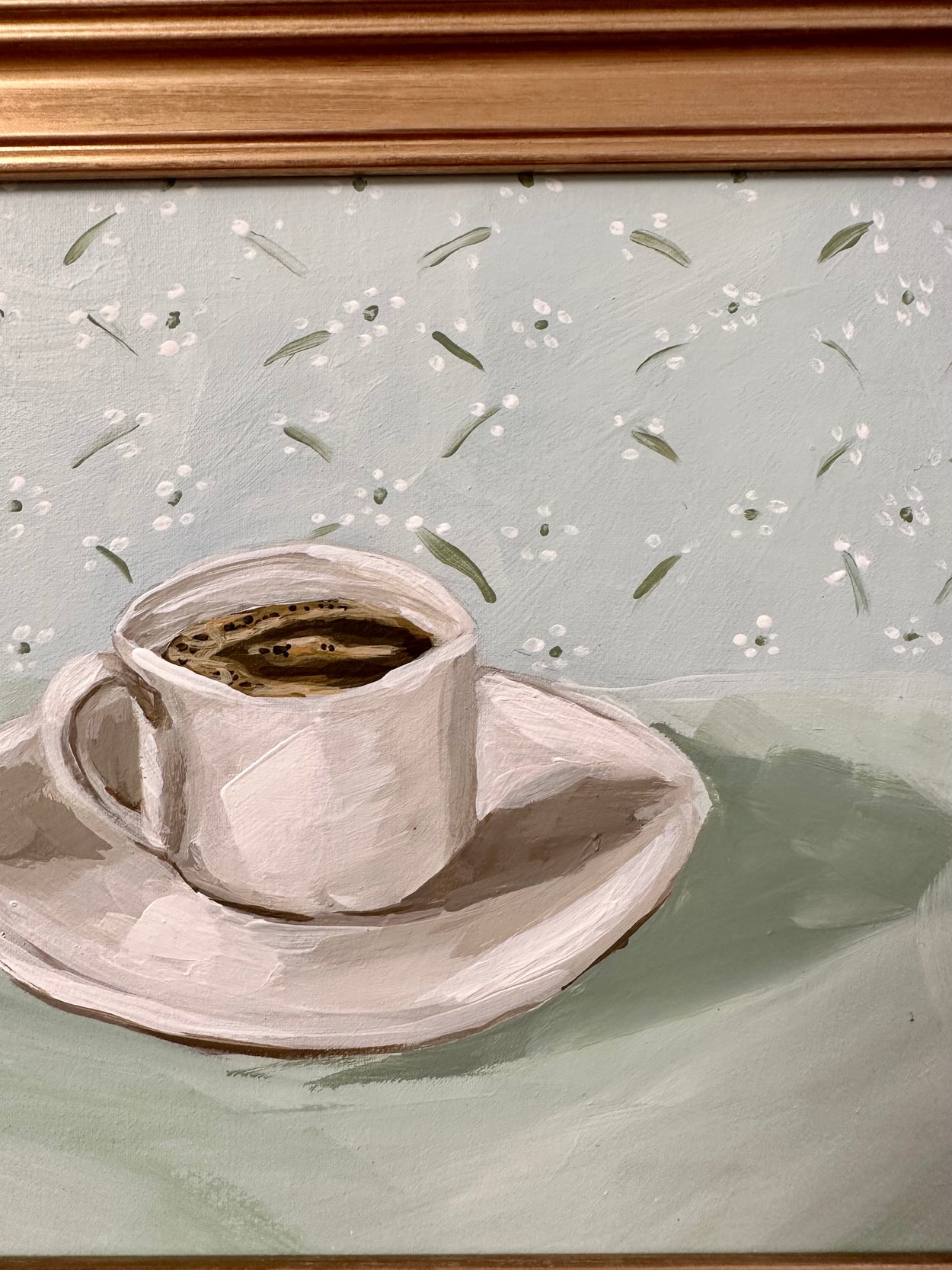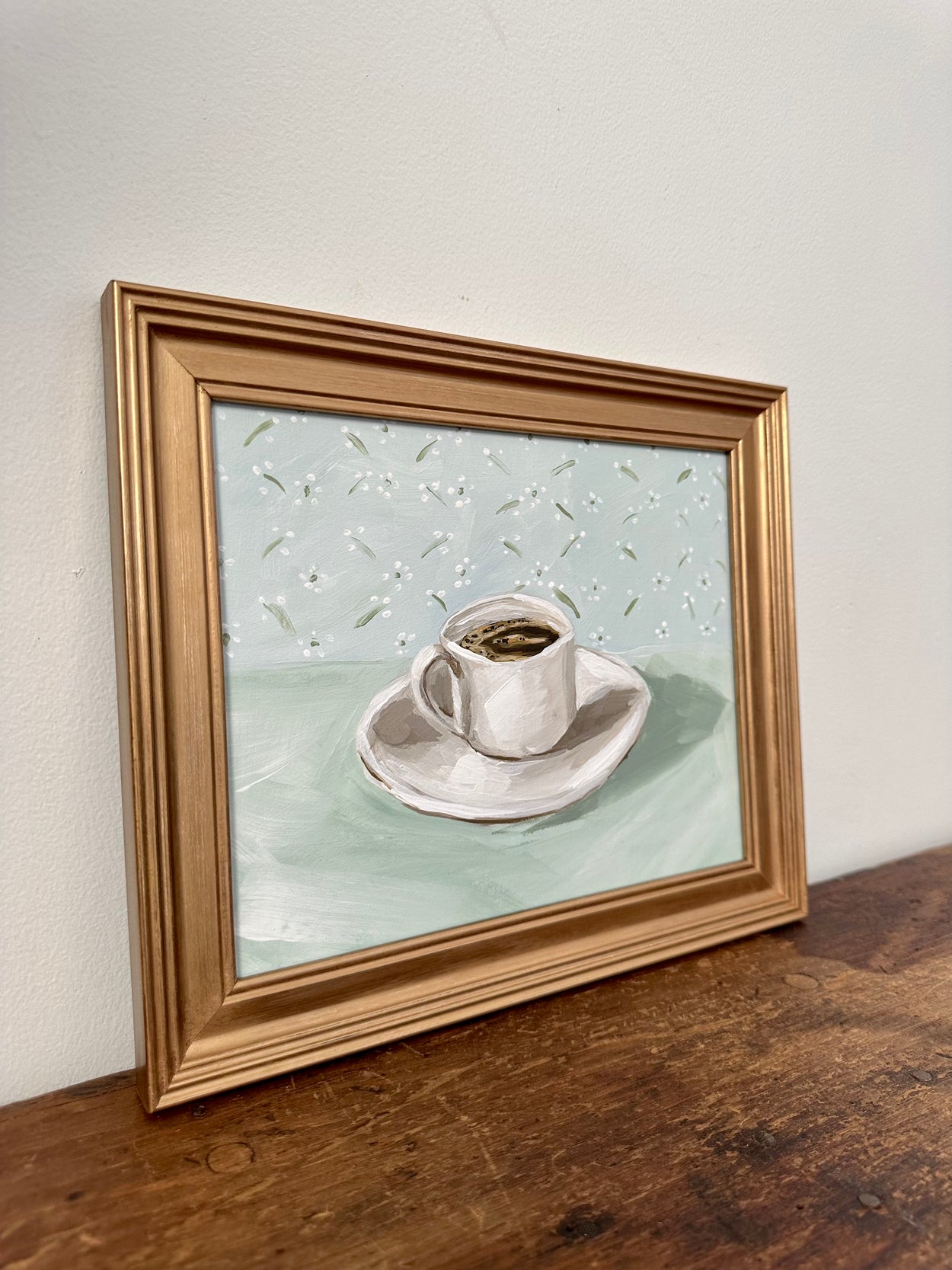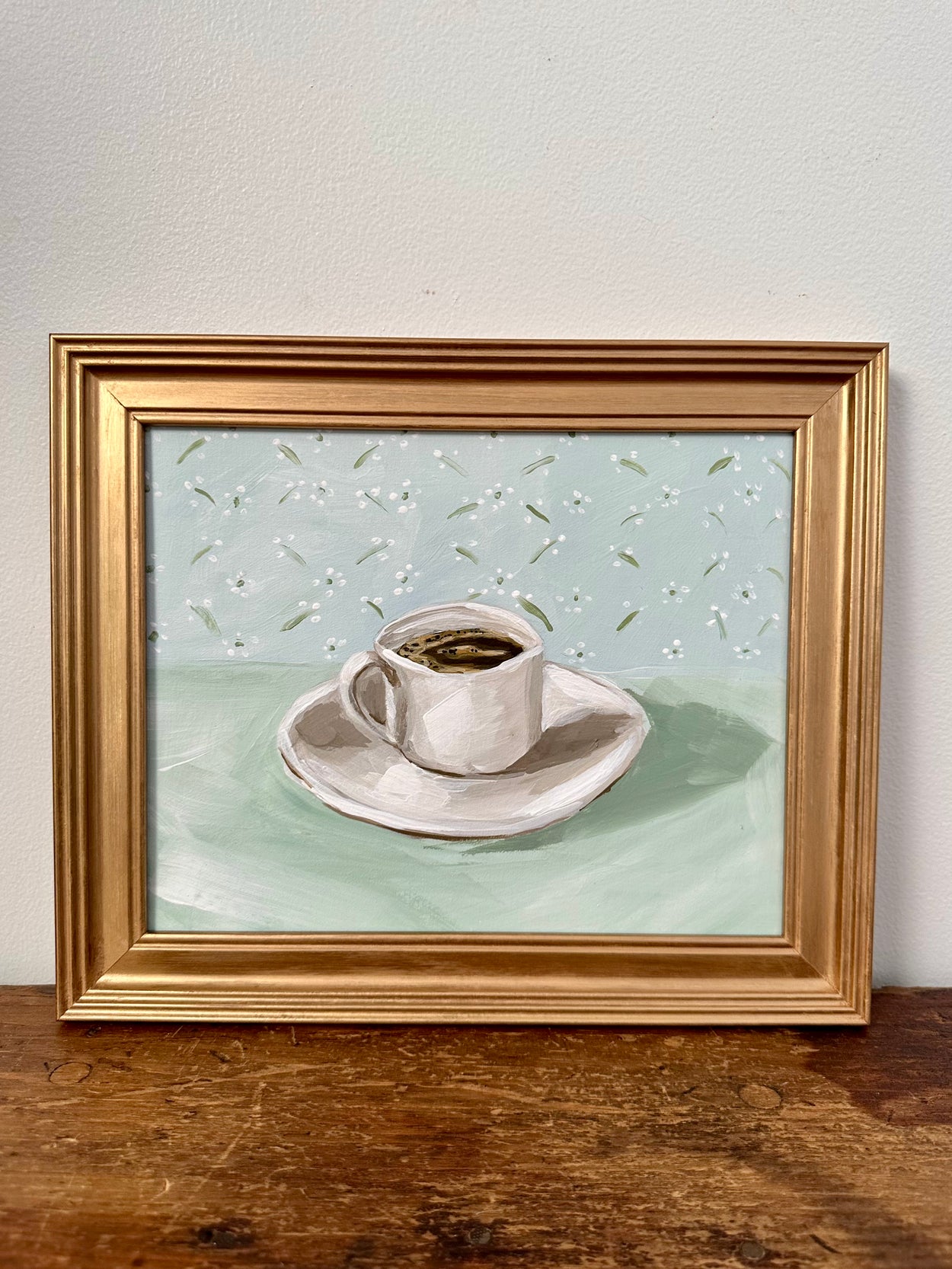 This painting celebrates a slow and peaceful morning ritual. It is acrylic on panel set into a golden frame. The painting size is 8”x 10” and the frame adds about an inch to each side. It is varnished and ready to hang.