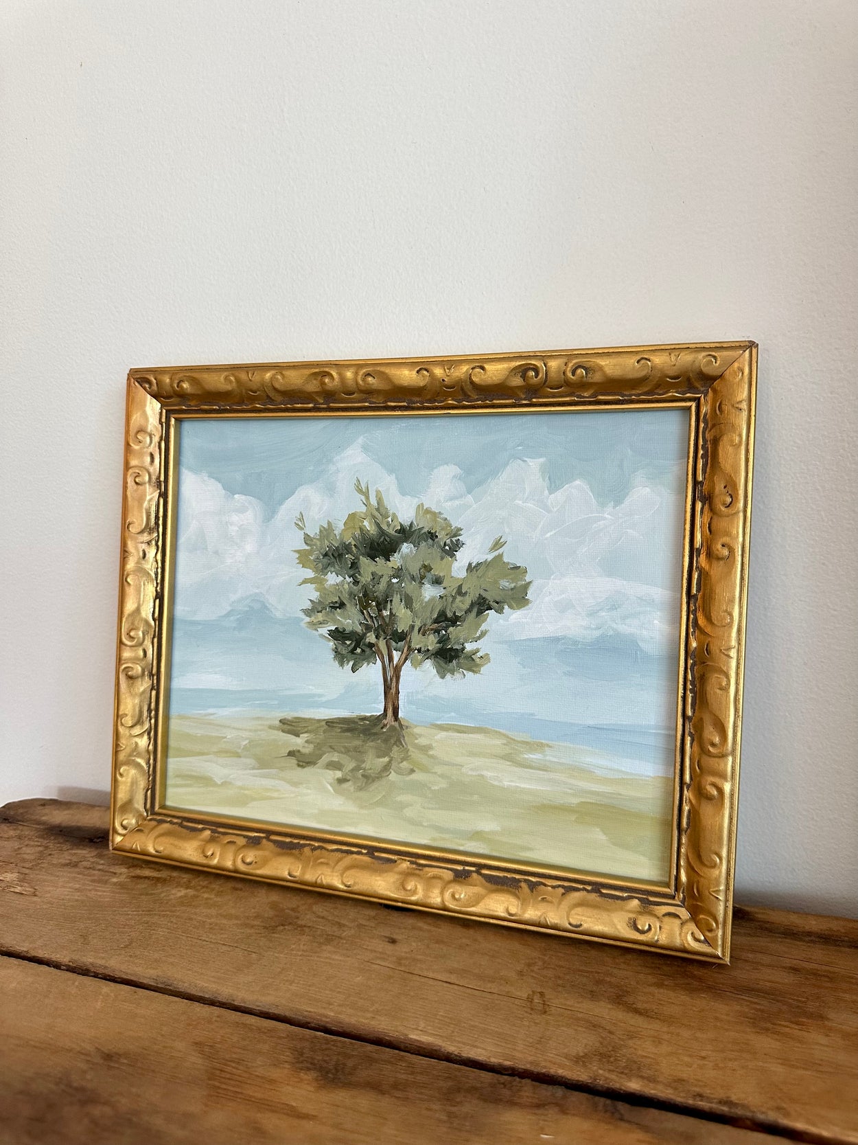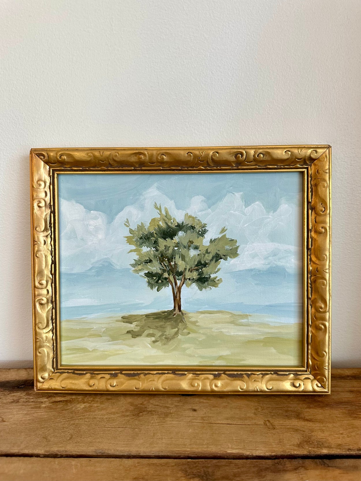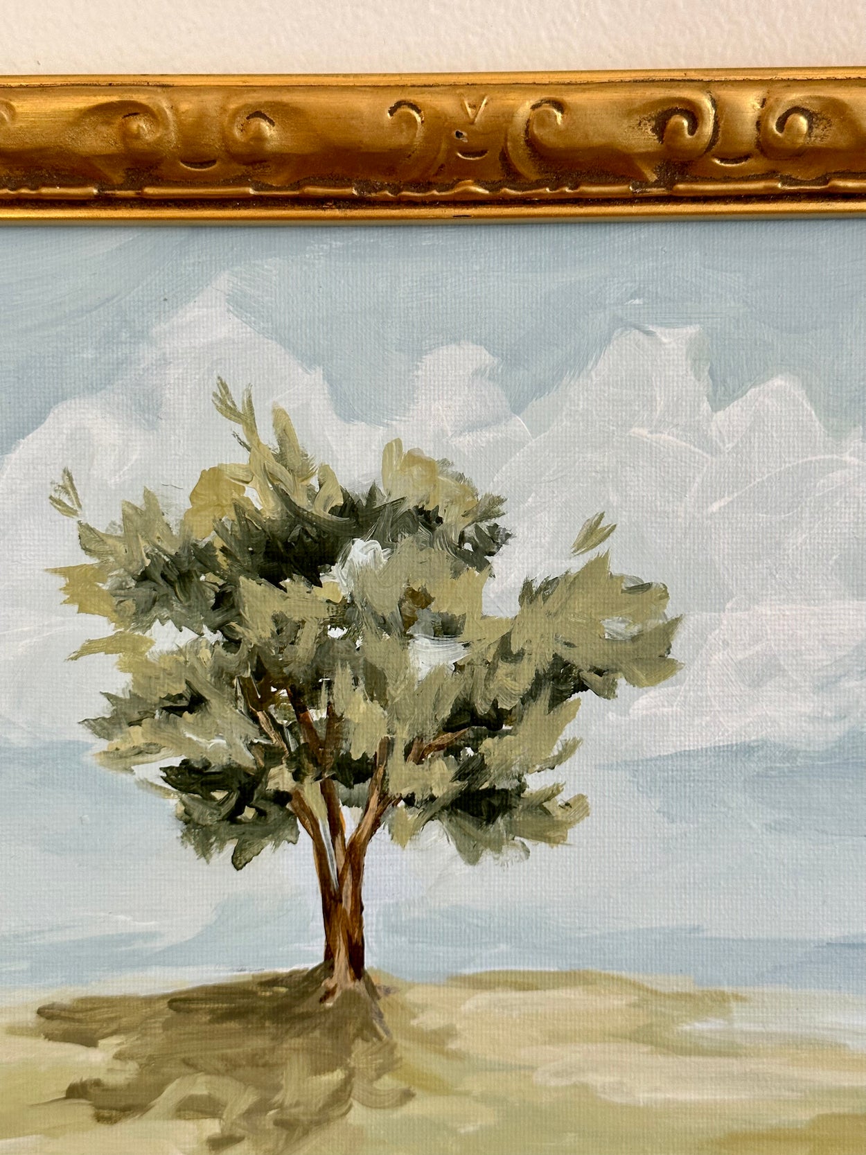 This painting celebrates the beauty and solidness of the tree. It is acrylic on panel set into a golden frame. The painting size is 8”x 10” and the frame adds about an inch to each side. It is varnished and ready to hang.