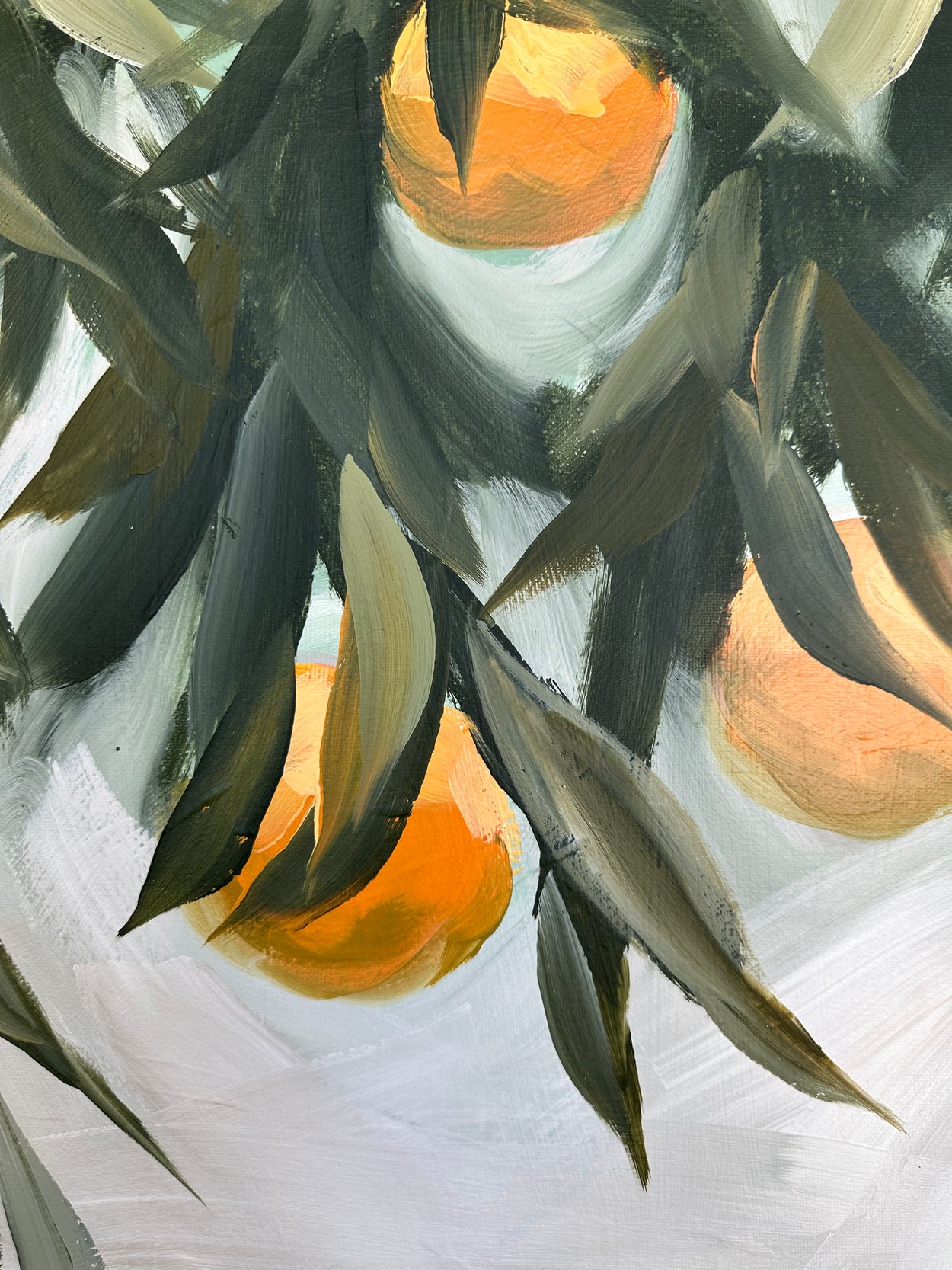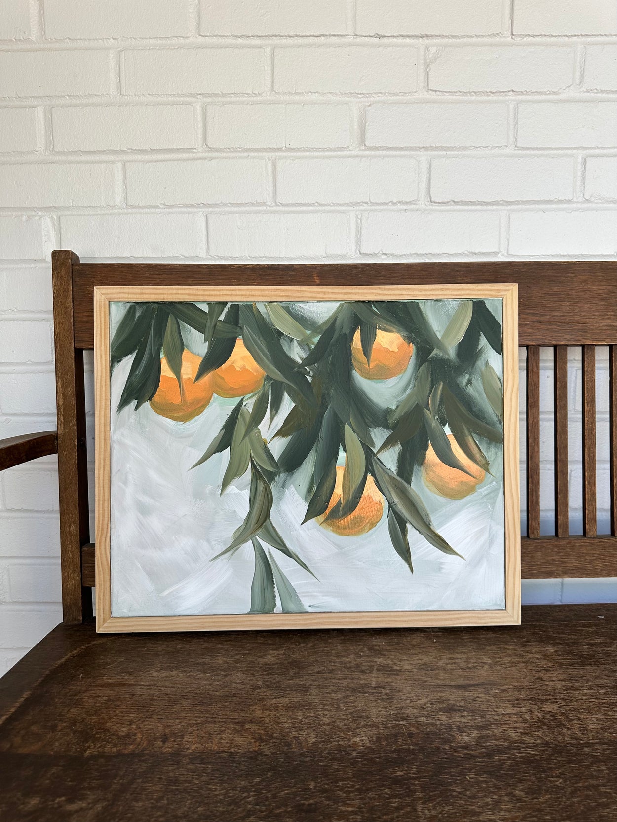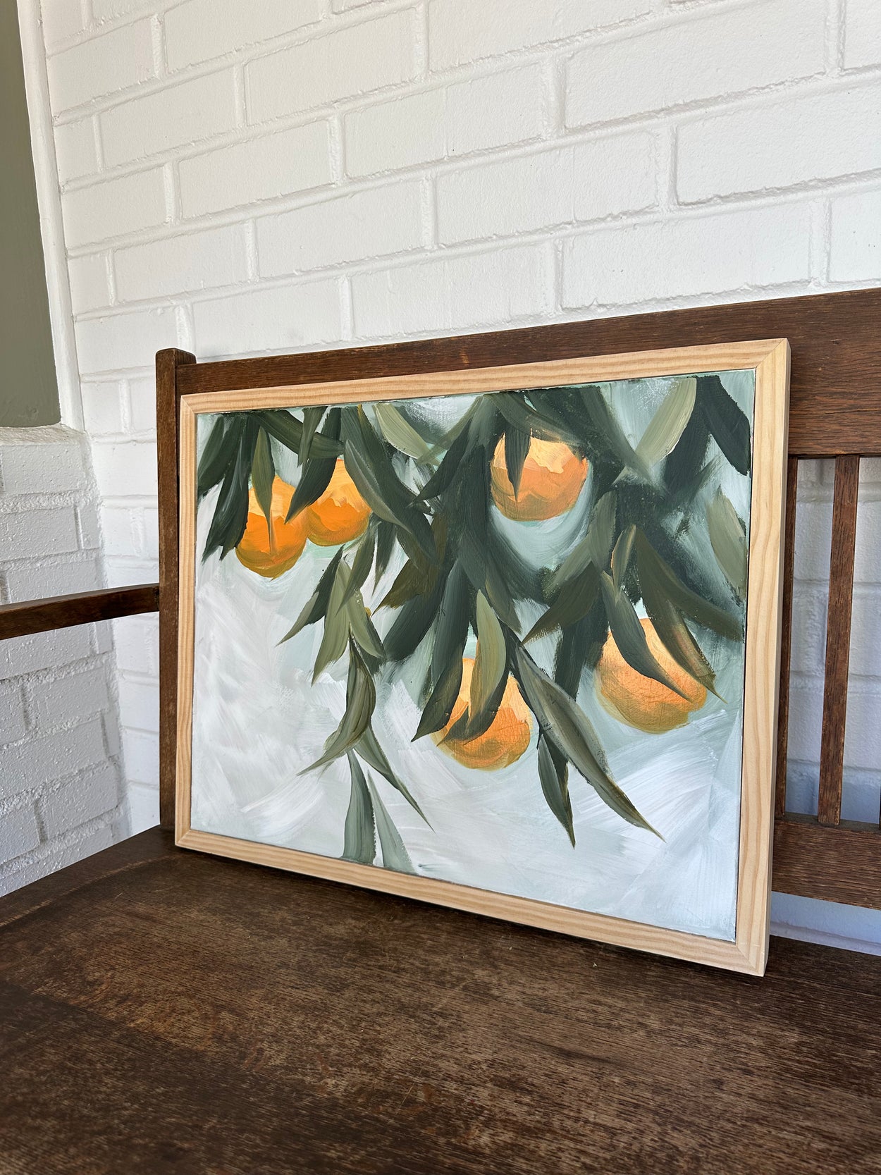 This is a beautiful orange painting wrapped in a natural modern frame. It is 16”x20” the frame adds an inch to each side. The painting is covered with a protective varnish and is ready to hang.