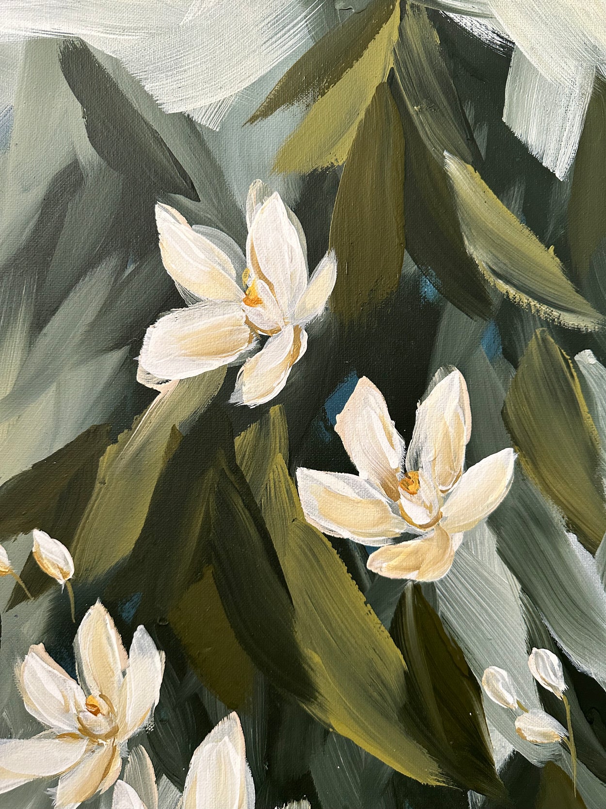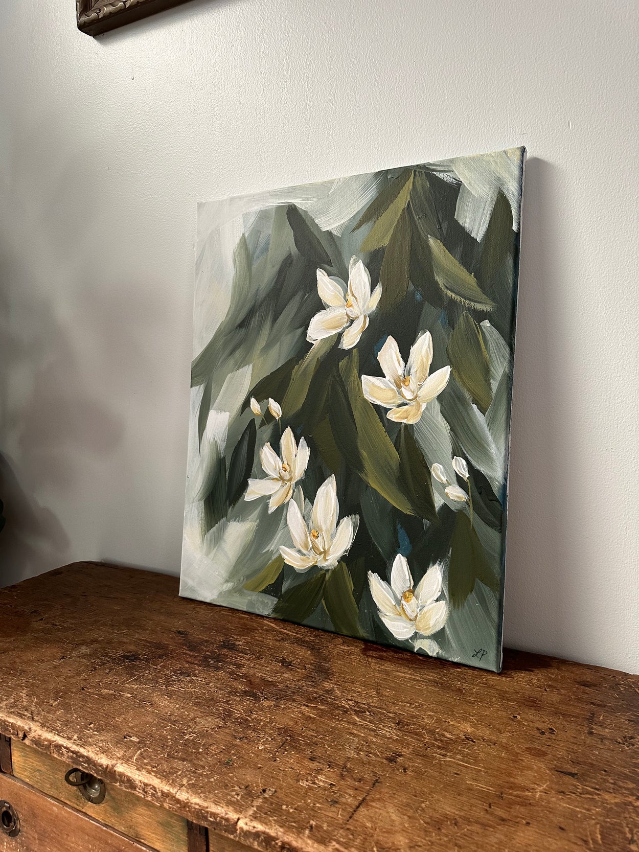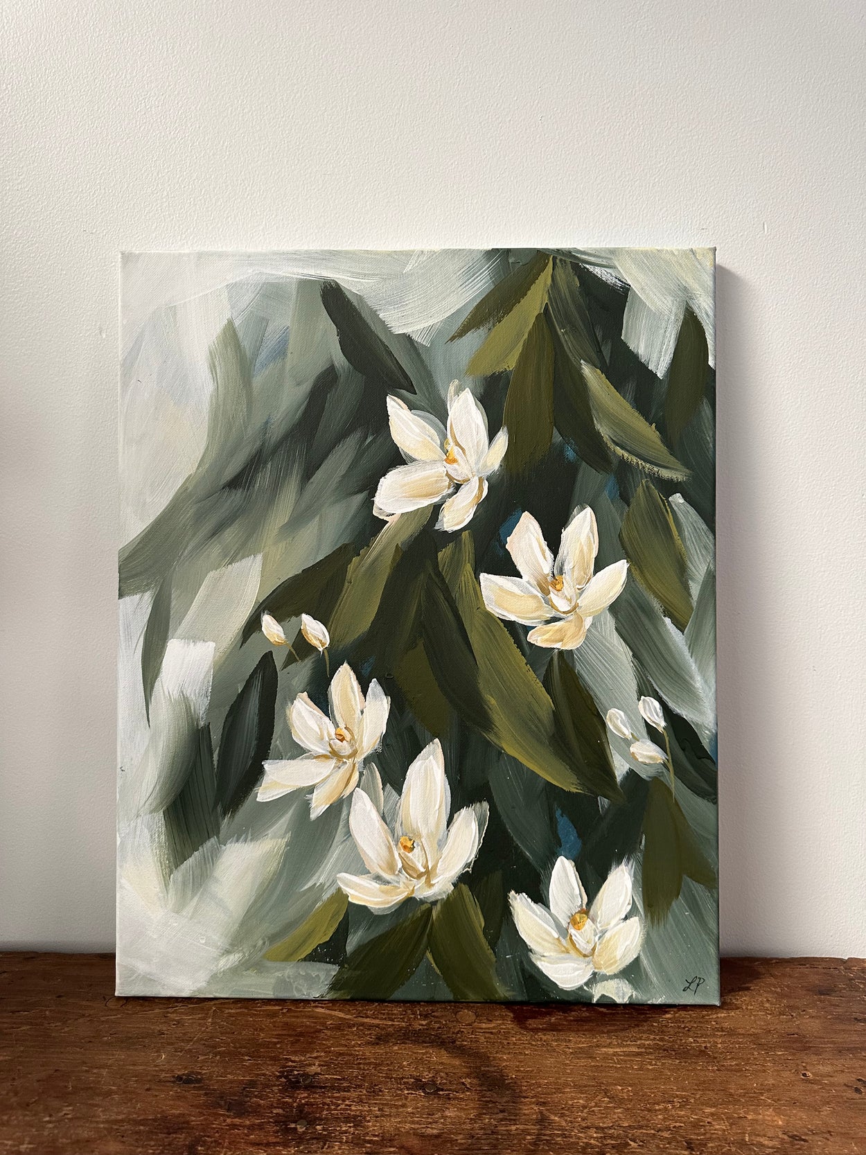 This is an original hand-painted work of art. It comes framed in walnut colored rustic wood and varnished. Frame adds about an inch on each side.