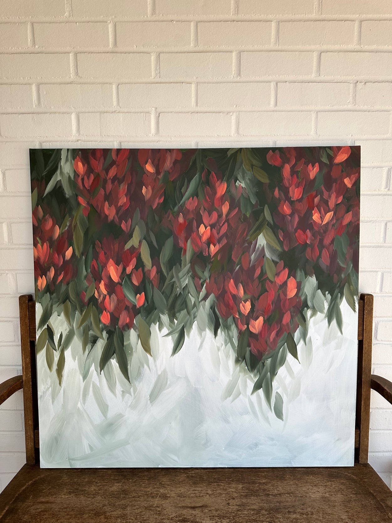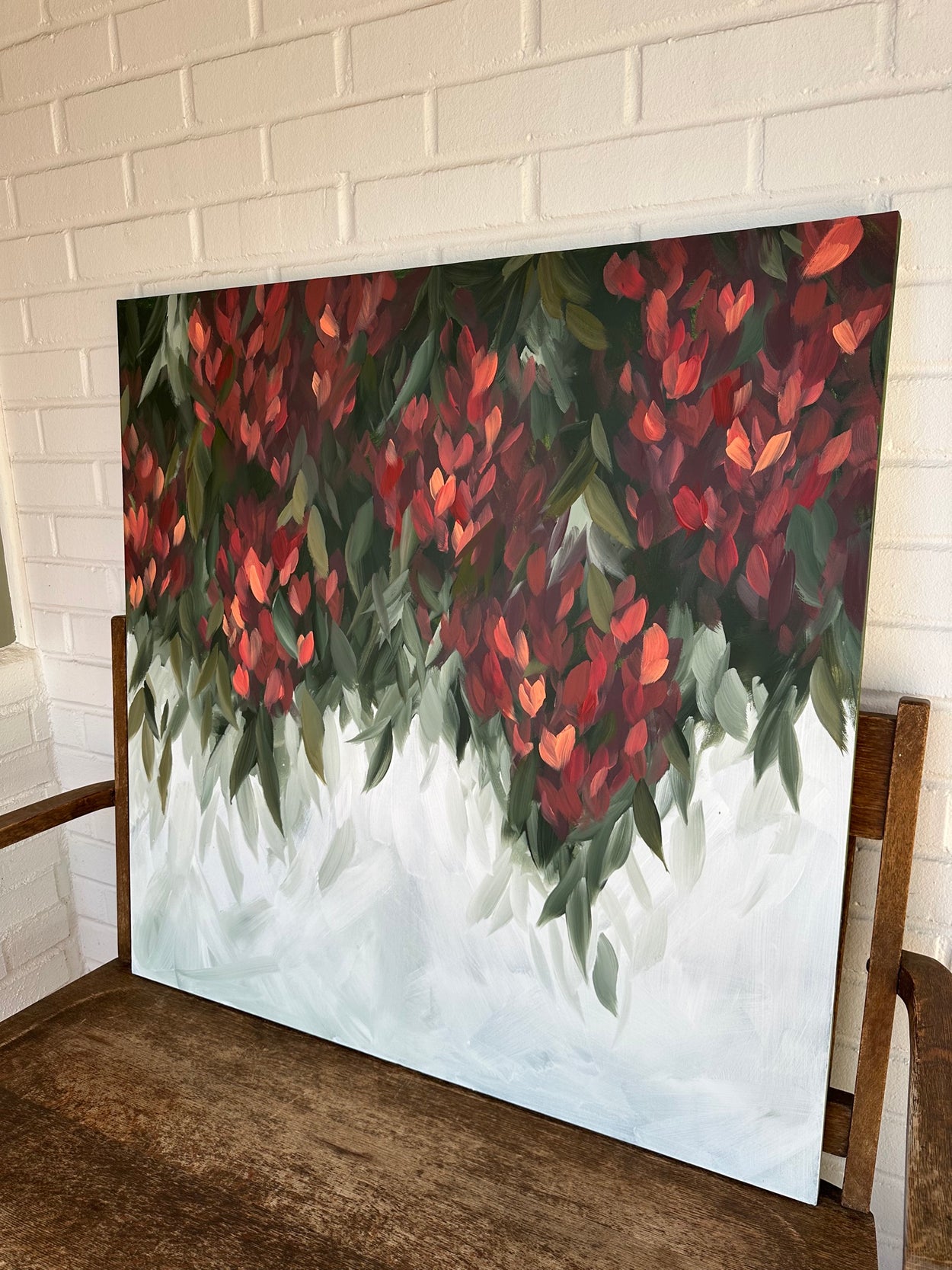 This painting is 36”x36” and comes framed in walnut toned rustic wood. The frame adds about an inch to each side. It is sealed with a protective varnish.