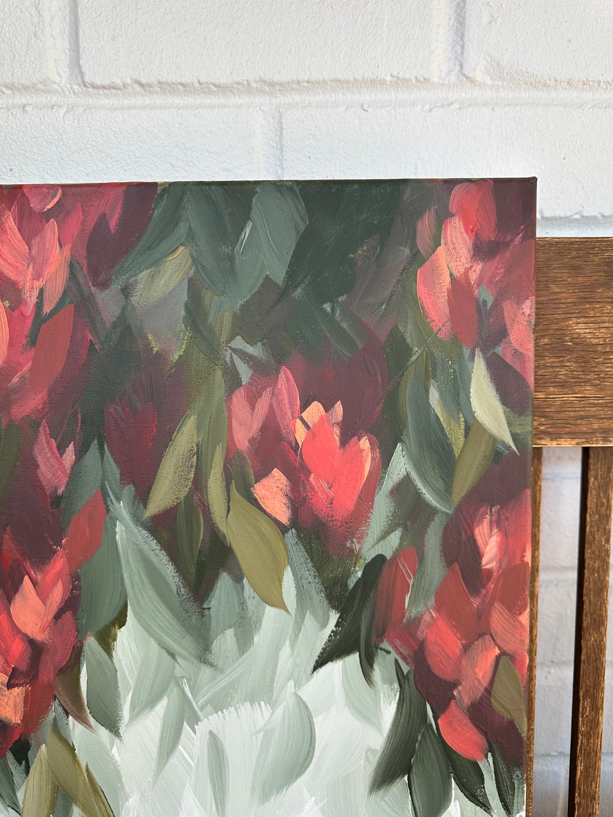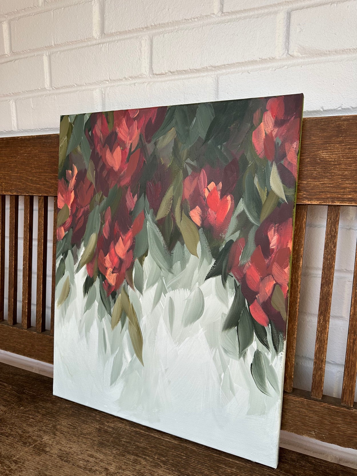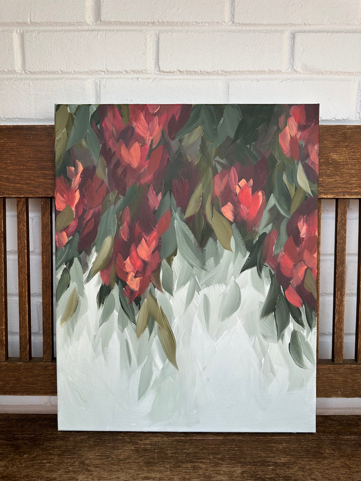 This painting is 16”x20” and comes framed in walnut toned rustic wood. The frame adds about an inch to each side. It is sealed with a protective varnish.
