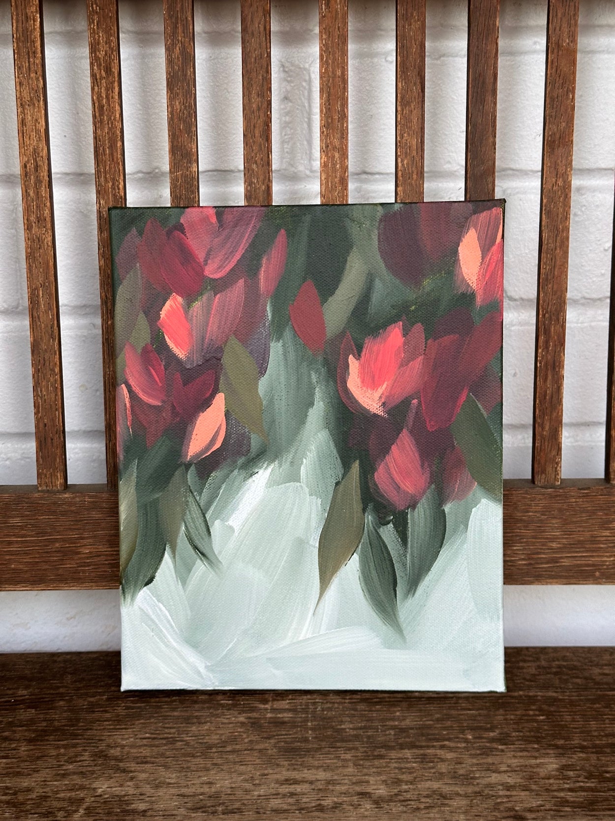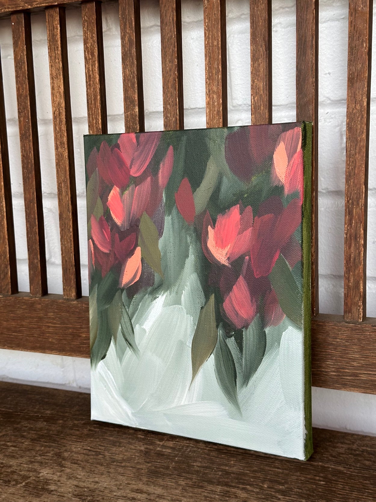 This painting is 8”x10” and comes framed in walnut toned rustic wood. The frame adds about an inch to each side. It is sealed with a protective varnish.